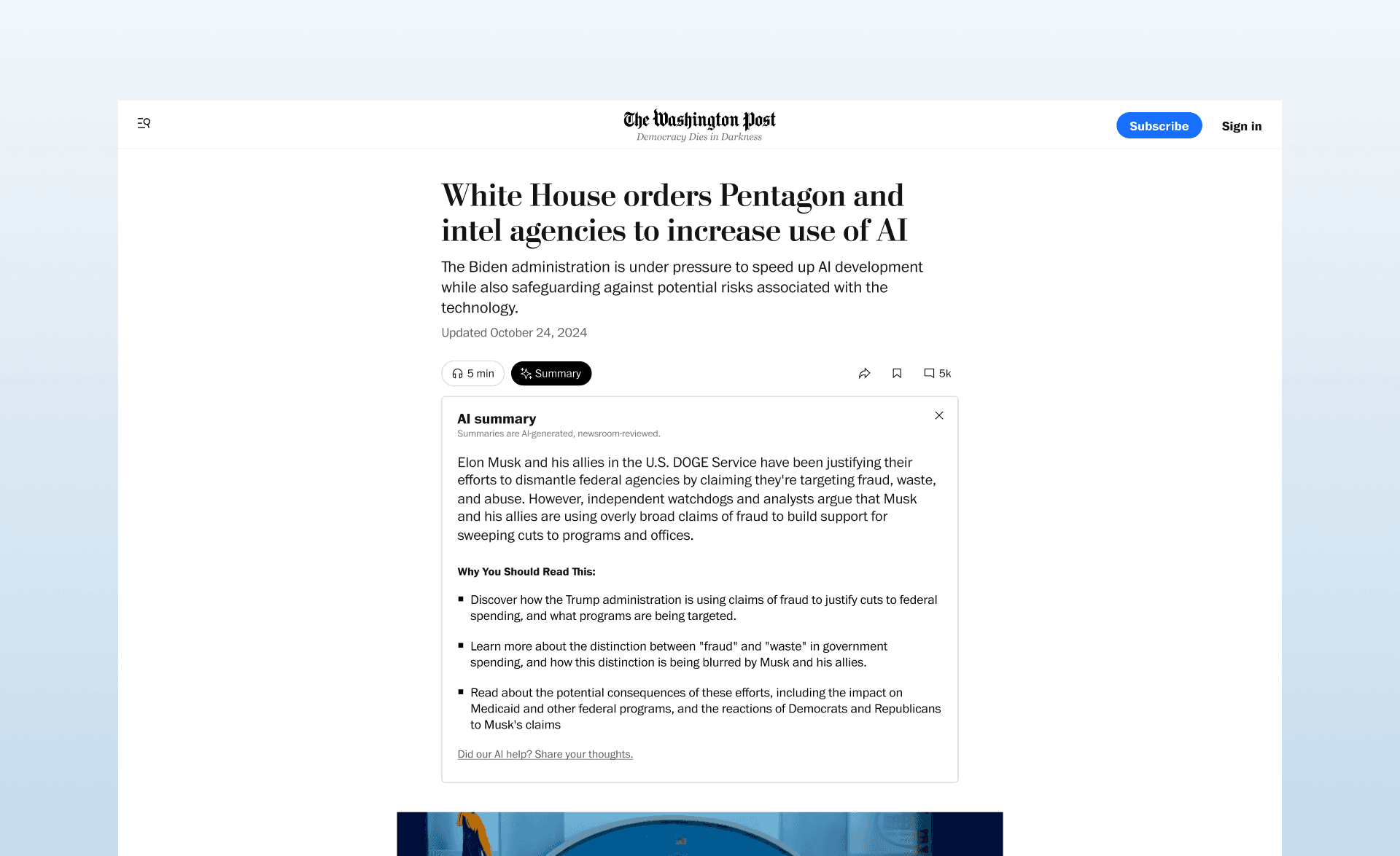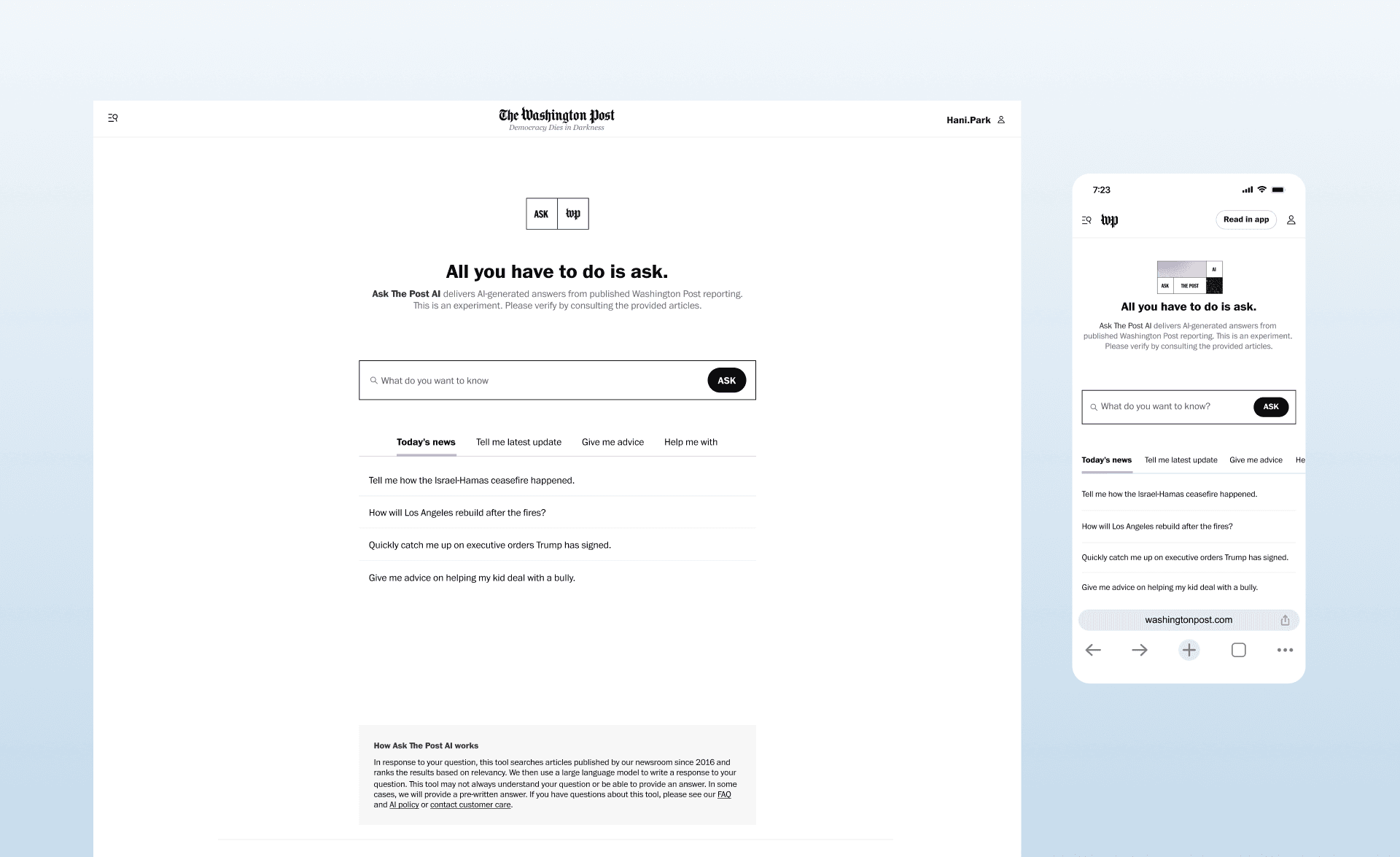 Ask The Post (ATP) is The Washington Post’s AI-powered agent that lets readers query our journalism in natural language. My role was to design how this agent interacts with users, making the experience intuitive, trustworthy, and engaging.
